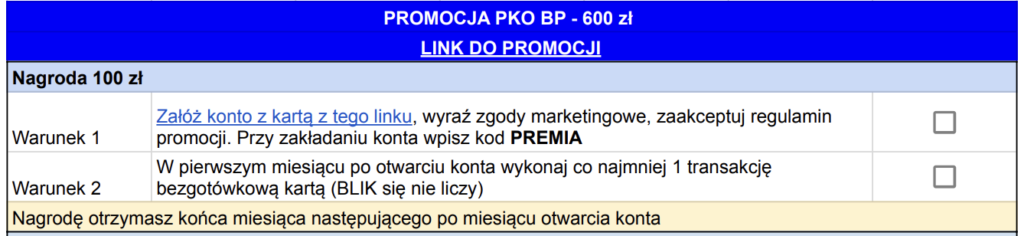 Za to otrzymasz nagrodę 100 zł do końca miesiąca, który nastąpi po miesiącu spełniania warunków. Czyli zakładasz konto w kwietniu, warunek spełniasz w maju, to nagroda wpada do końca czerwca.