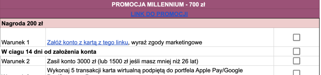 Przy zakładaniu zaakceptuj wszystkie zgody marketingowe i pliki cookies. Wyraź też zgodę na świadczenie usługi Zwroty za zakupy z Millennium Goodie. Nie odwołuj zgód do czasu wypłaty nagrody. - W ciągu 14 dni od otwarcia konta:
